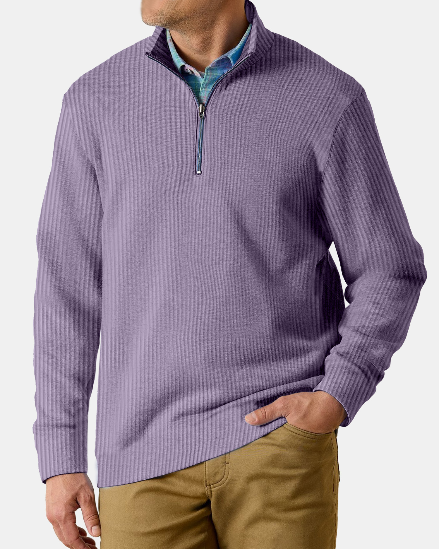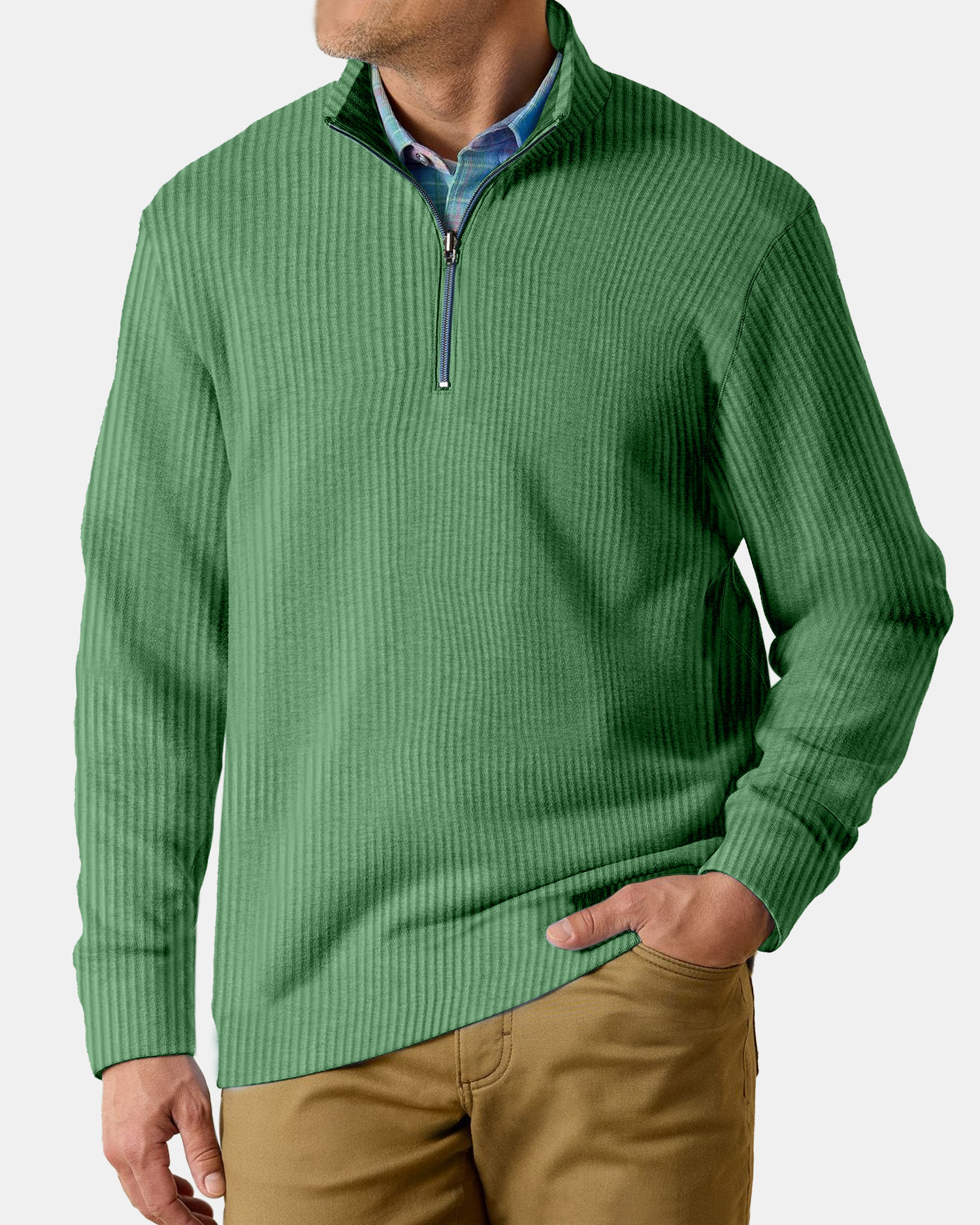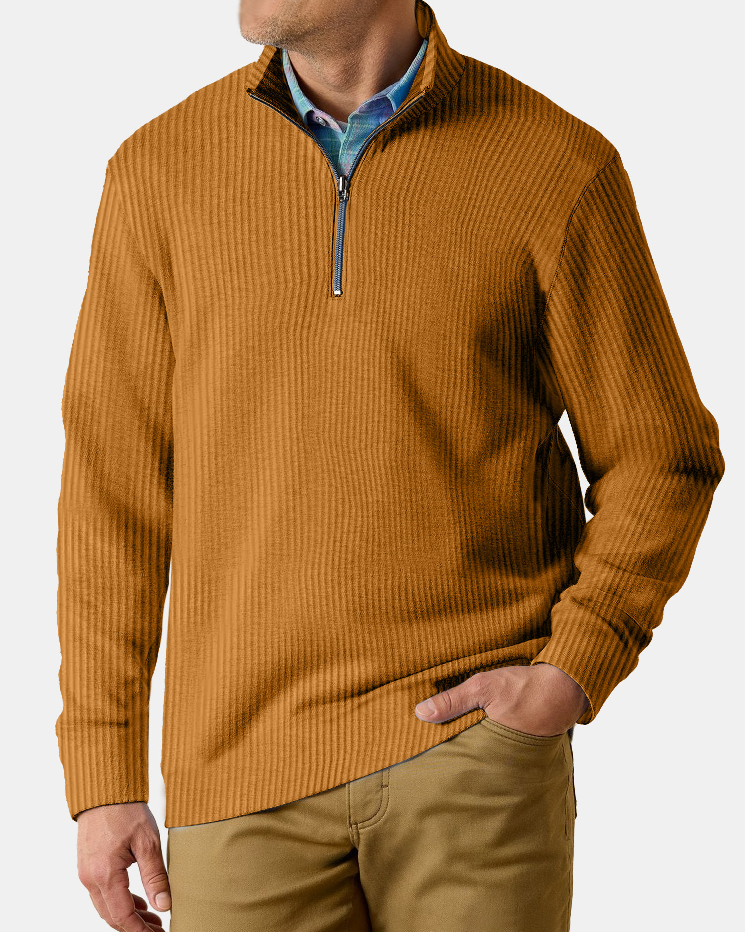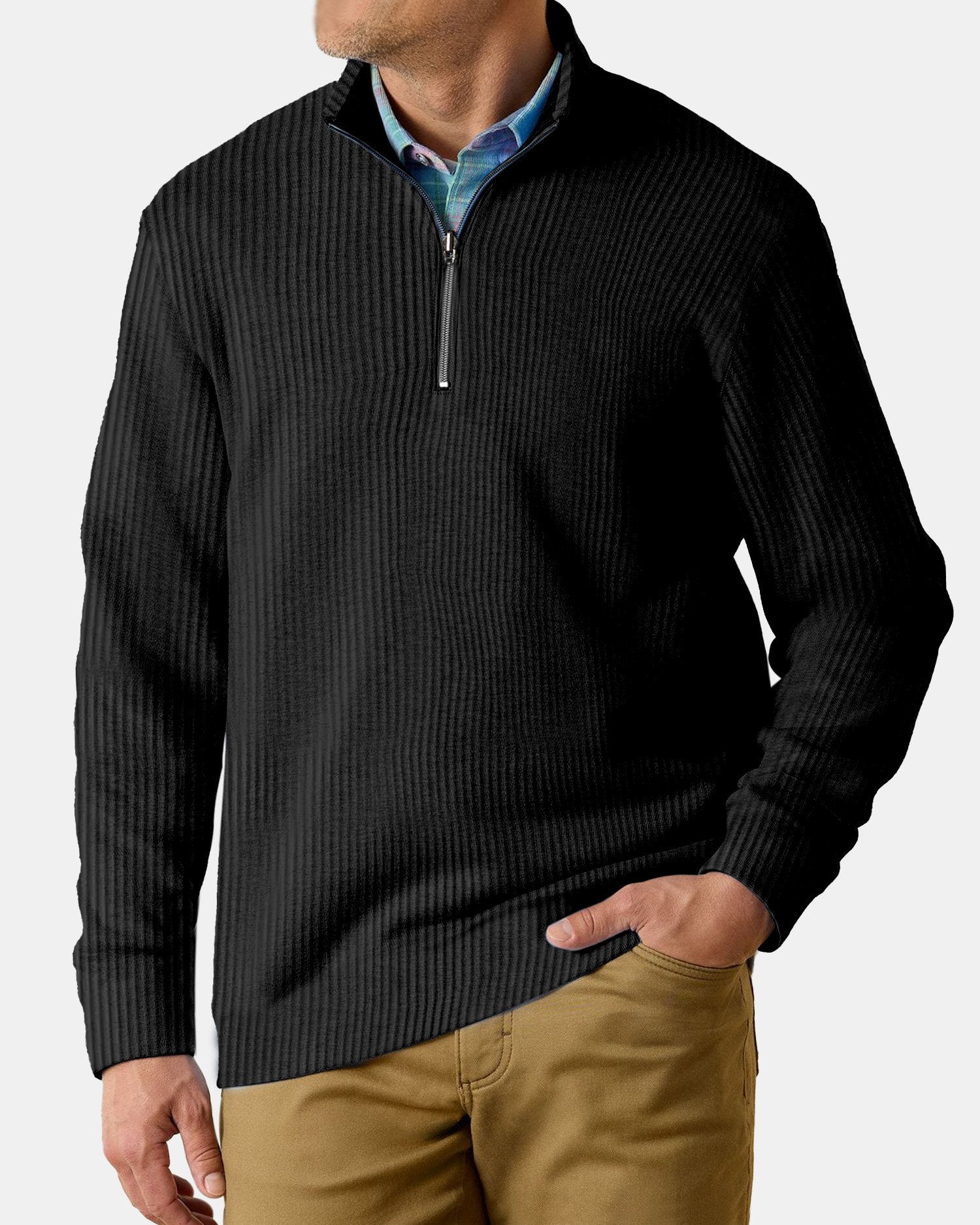 Men's Casual Comfortable Vertical Stripe Solid Color Zipper Long Sleeve Polo Shirt