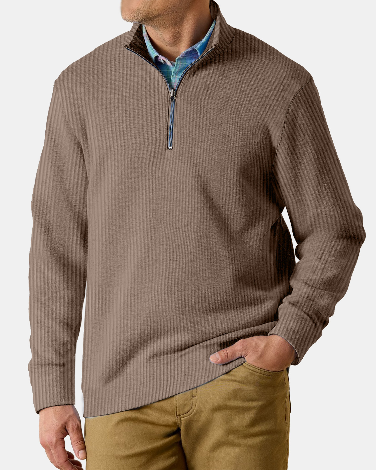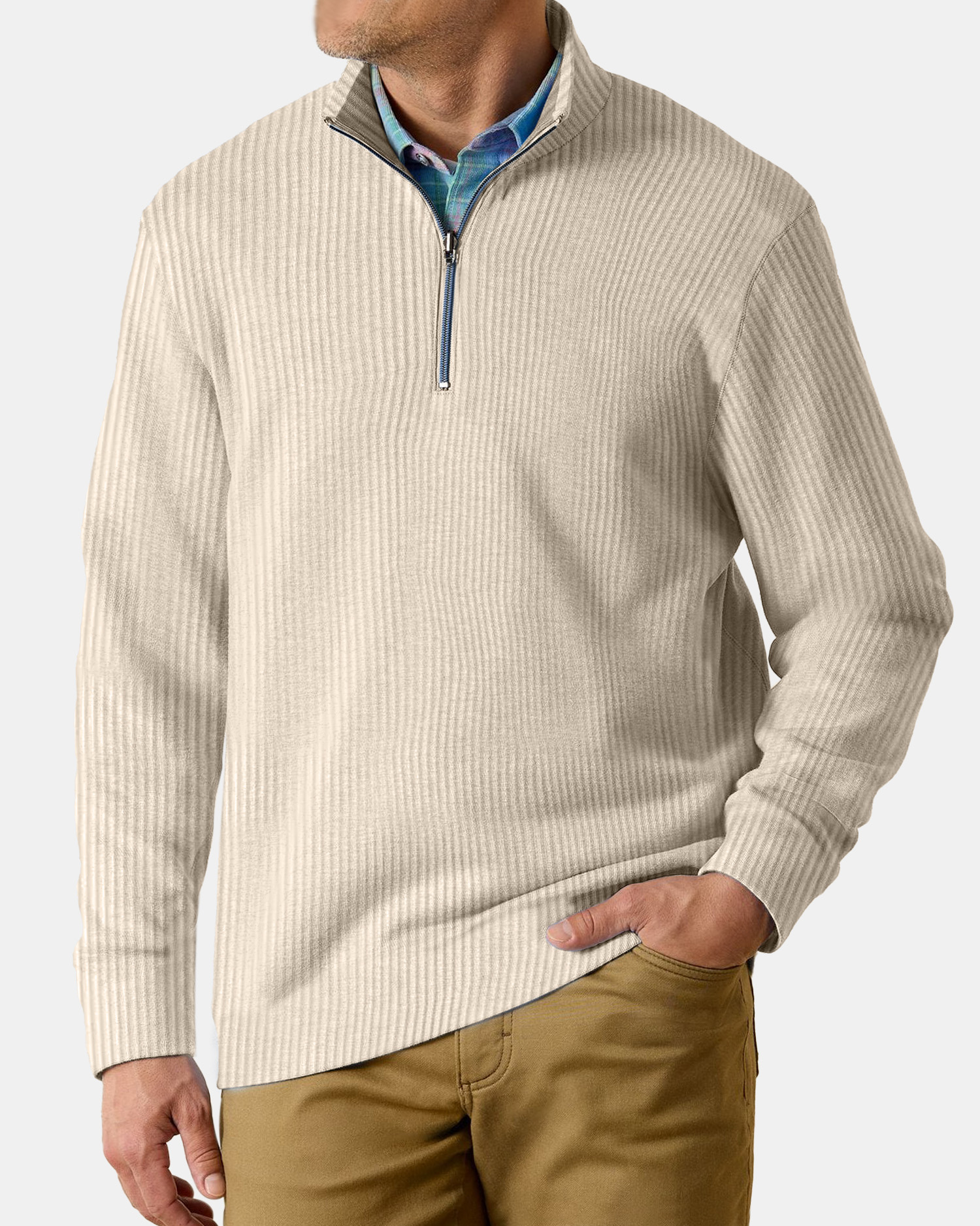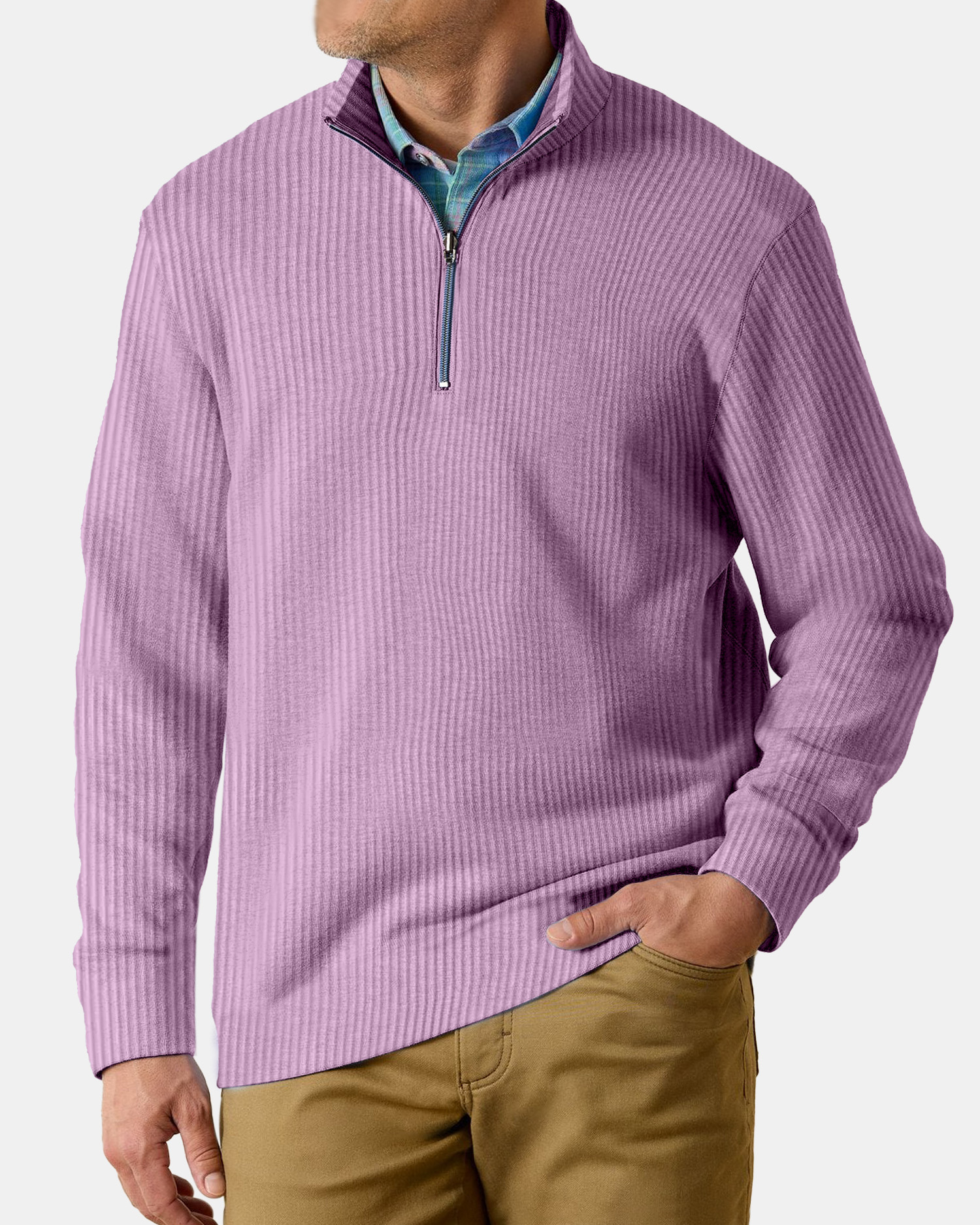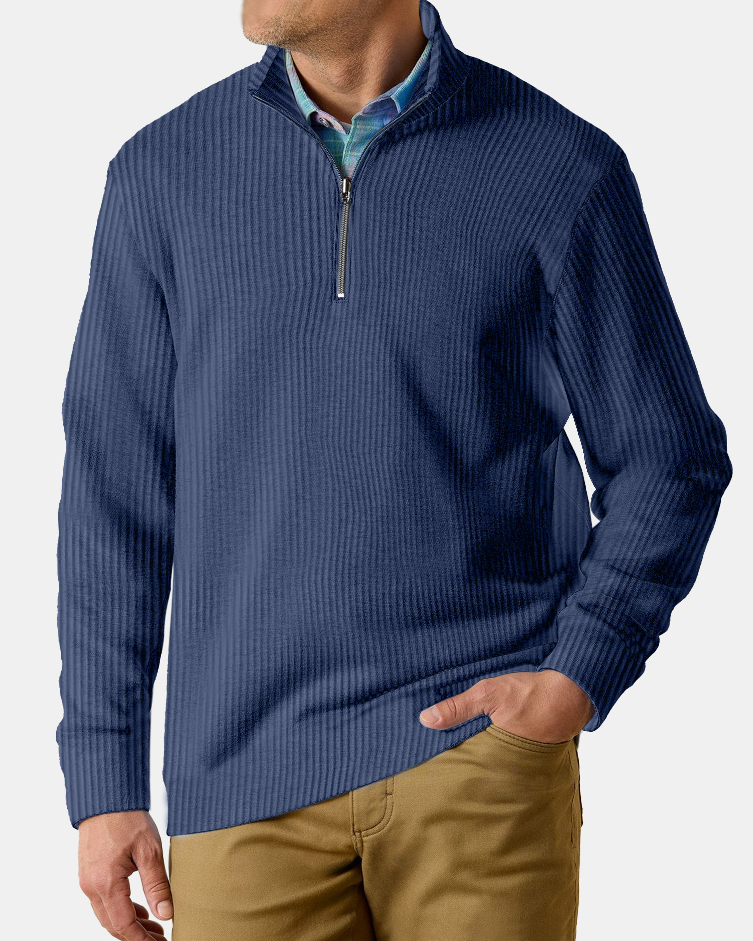 Men's Casual Comfortable Vertical Stripe Solid Color Zipper Long Sleeve Polo Shirt