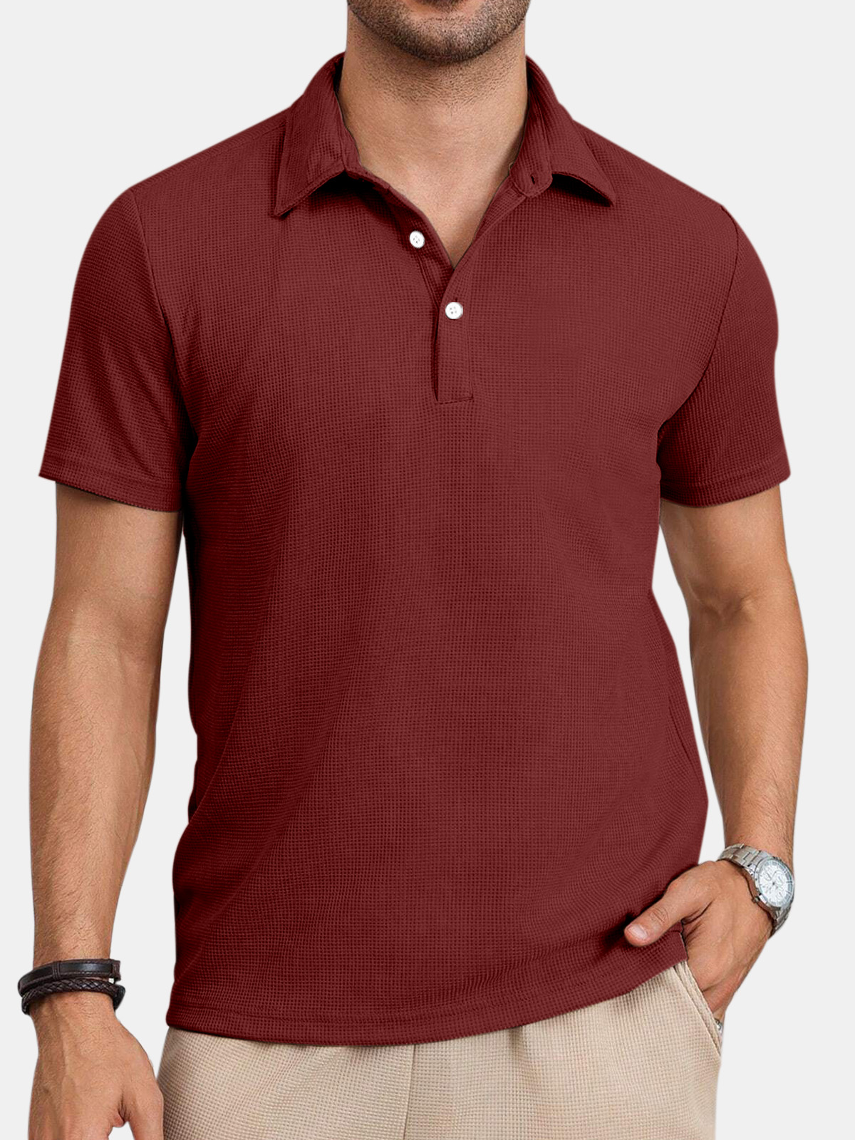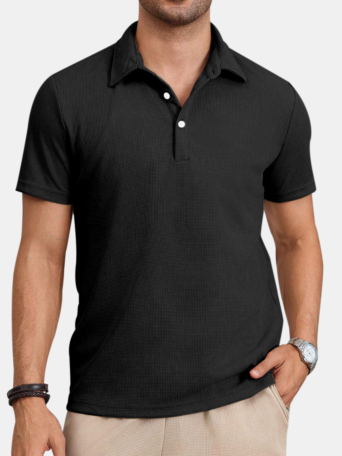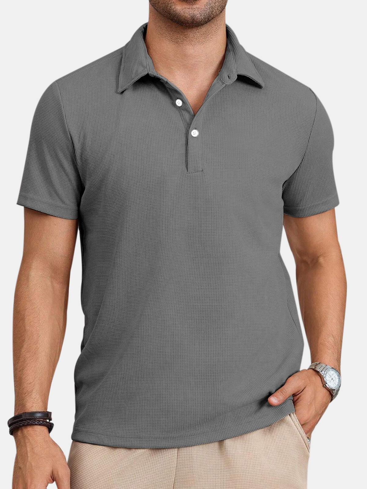 Men's Casual Comfortable Waffle Button Solid Color Short Sleeve Polo Shirt