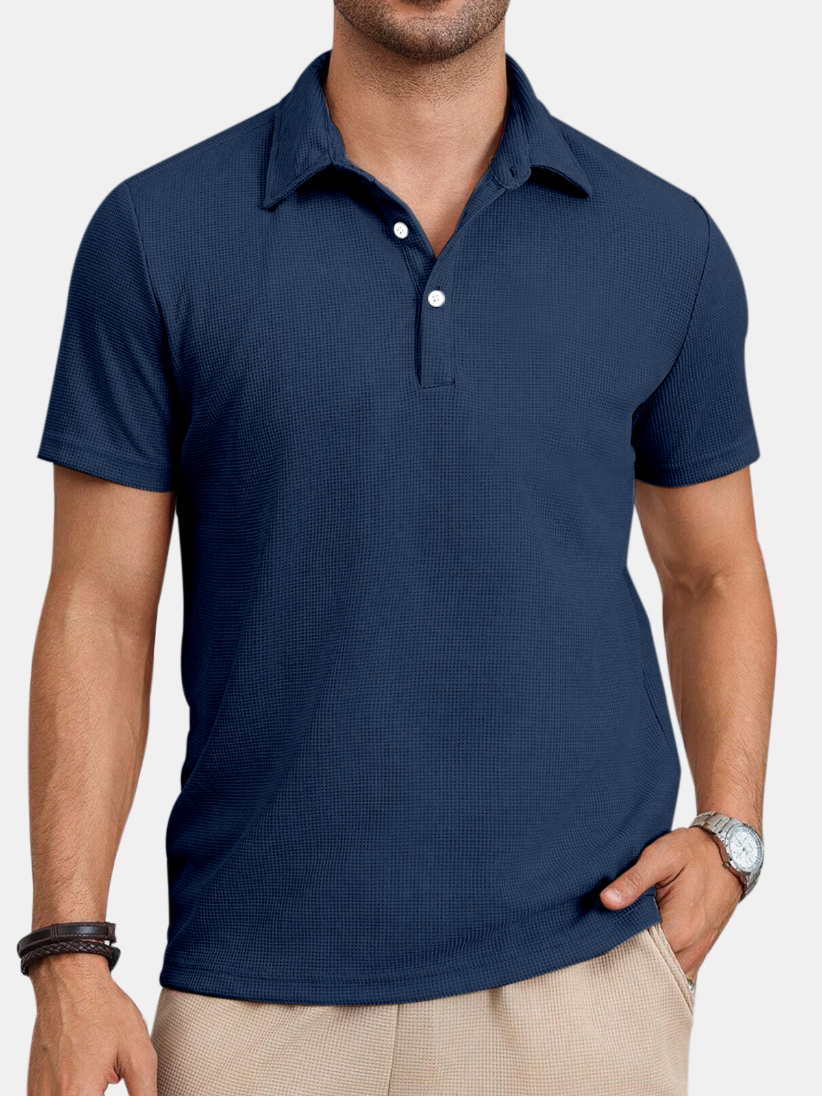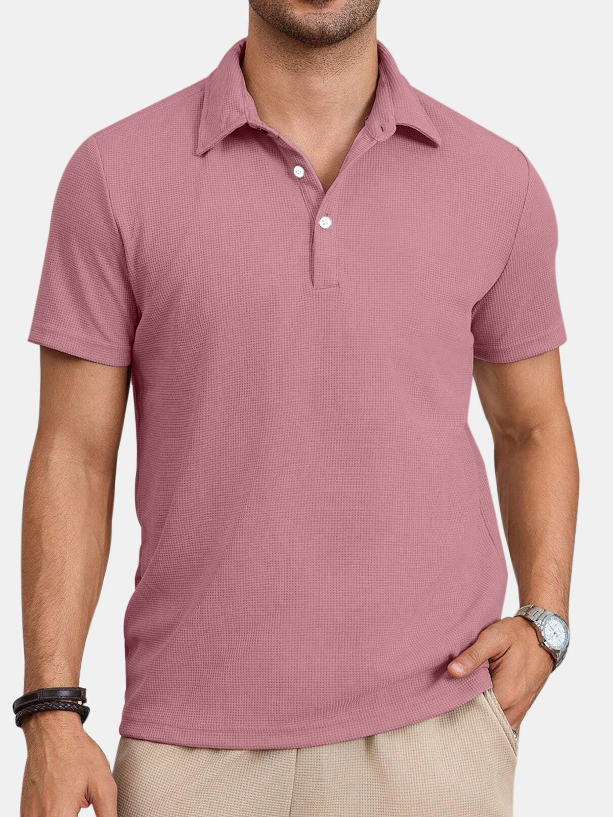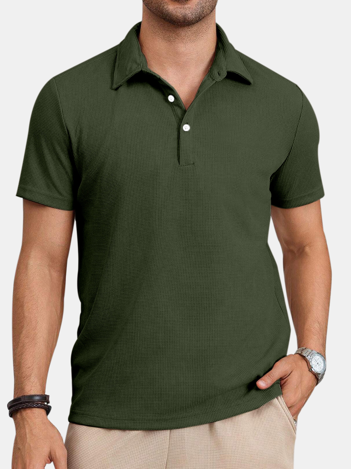 Men's Casual Comfortable Waffle Button Solid Color Short Sleeve Polo Shirt
