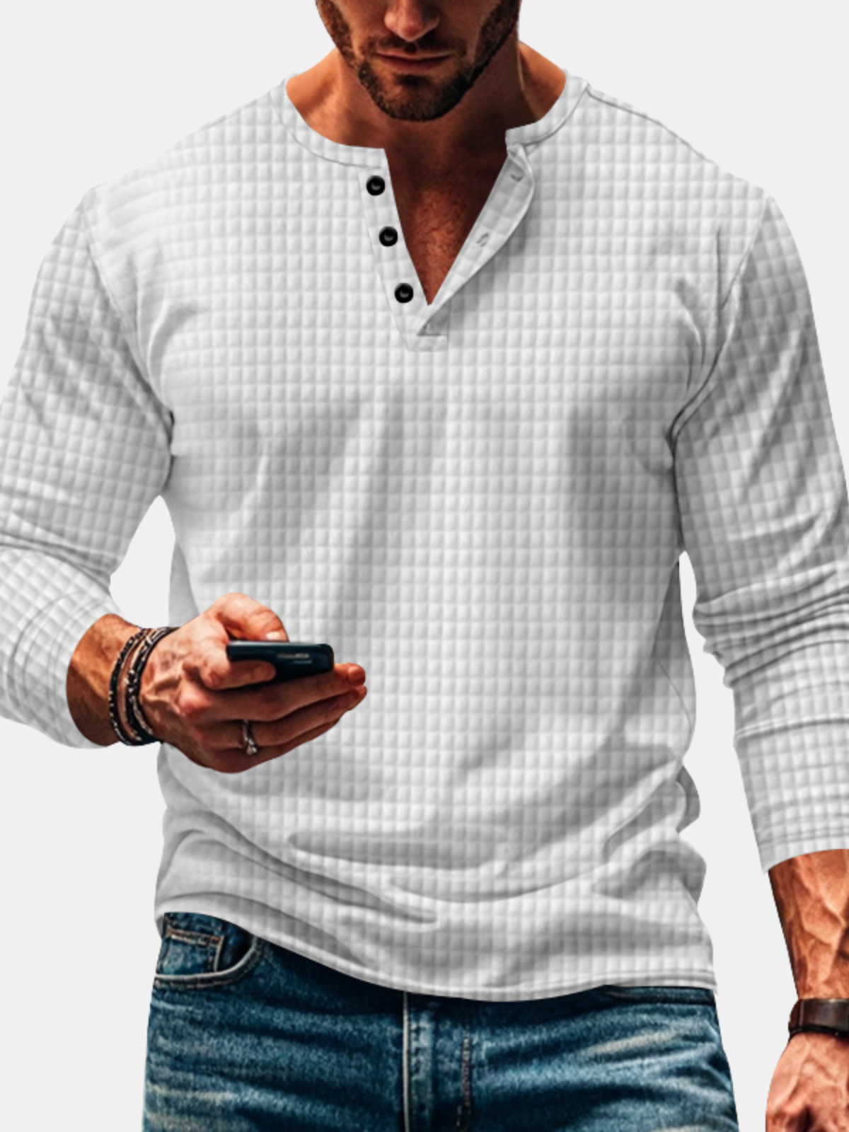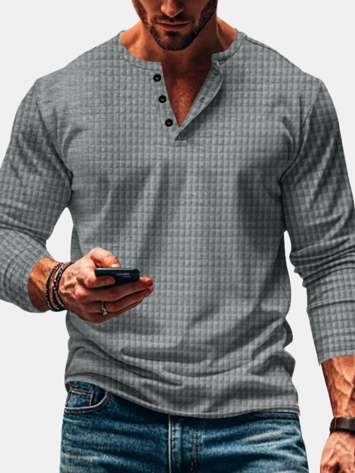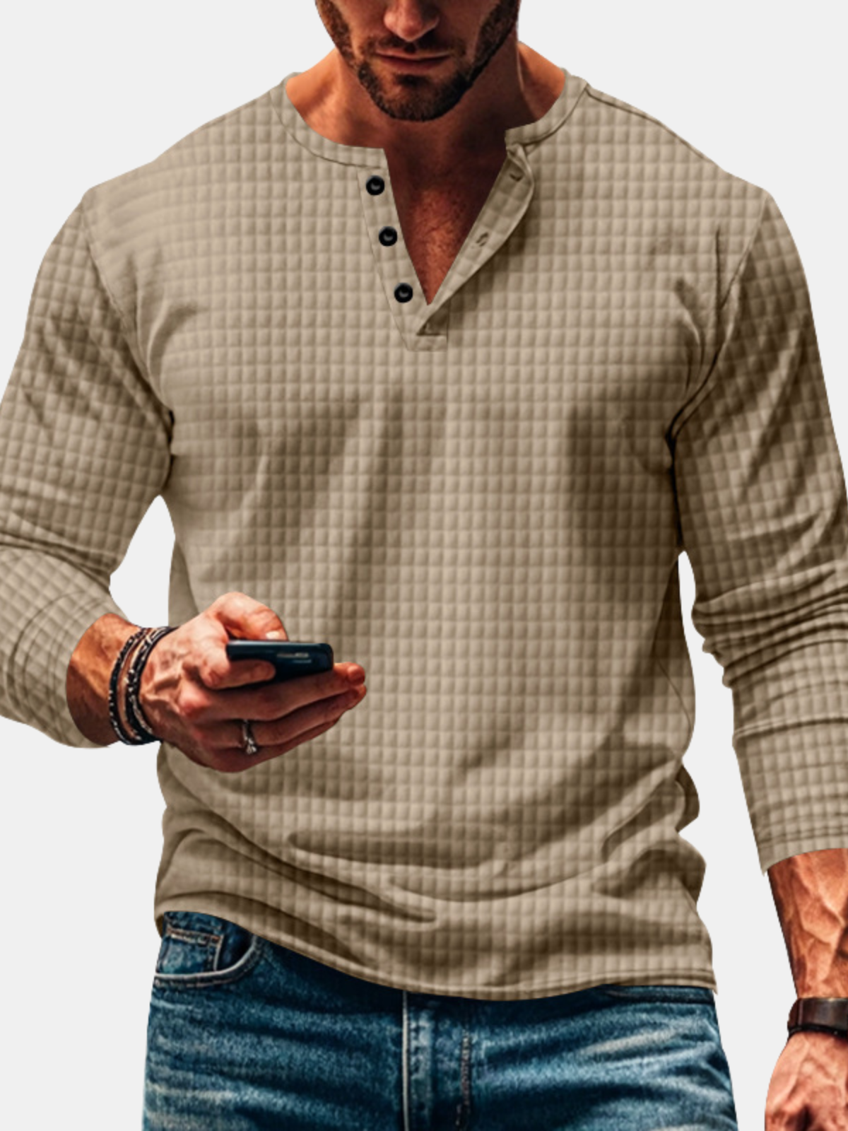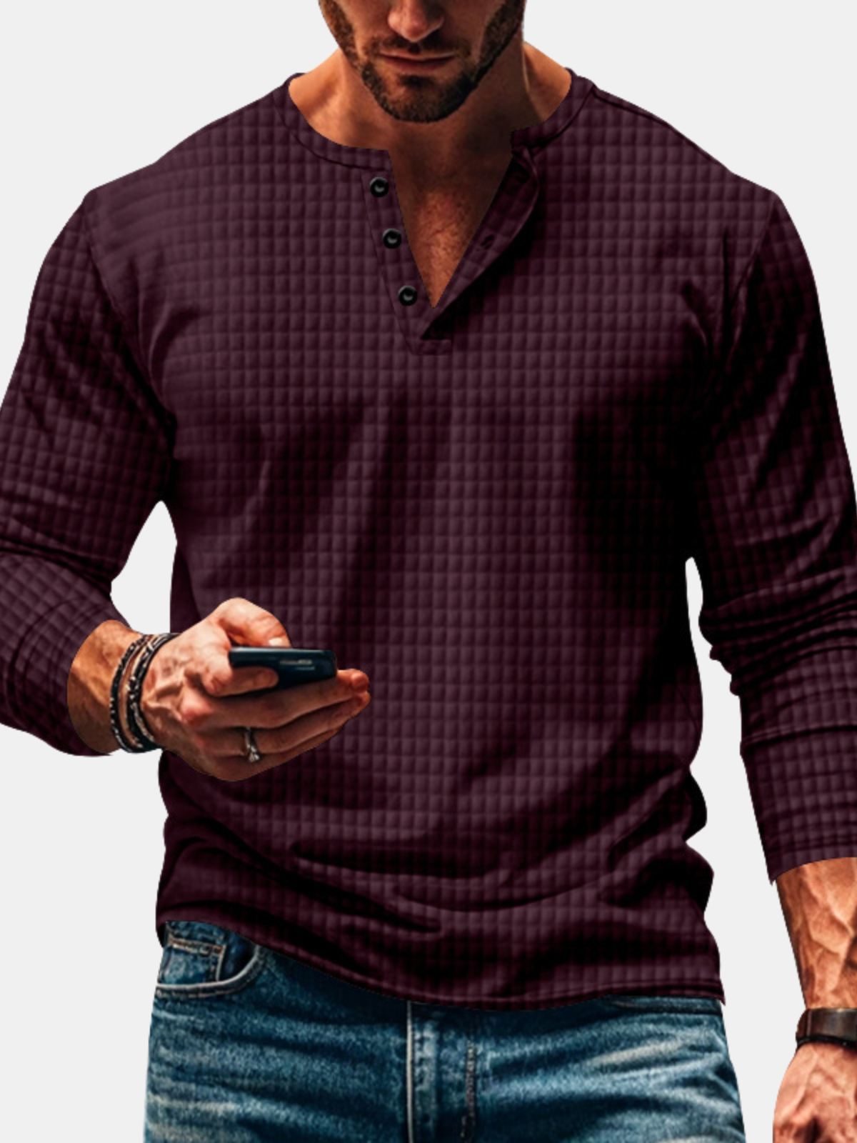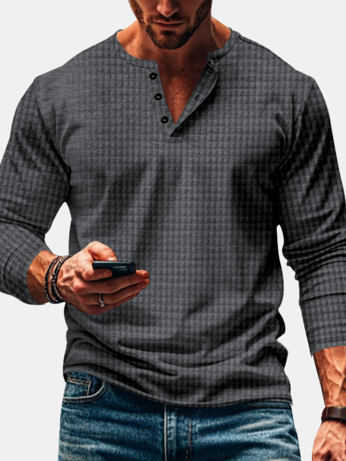 Men's Casual Long Sleeve Crewneck Button Plaid Waffle Print T-shirt Pullover Sweatshirt