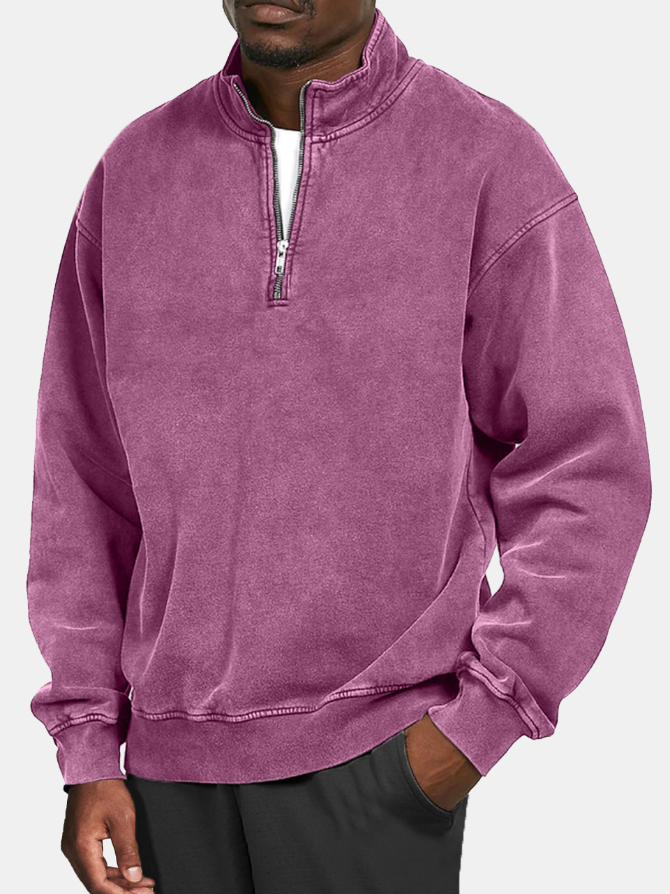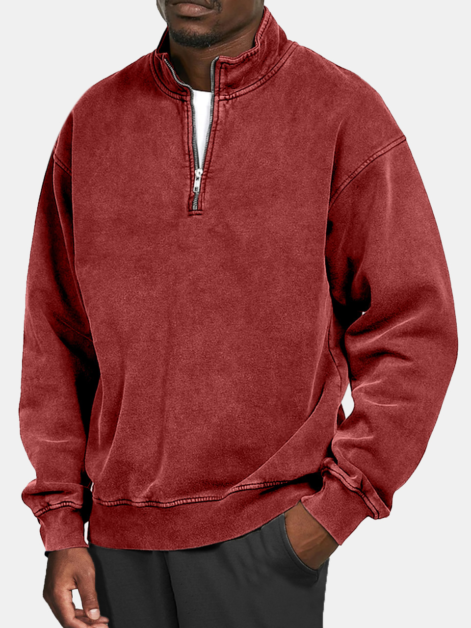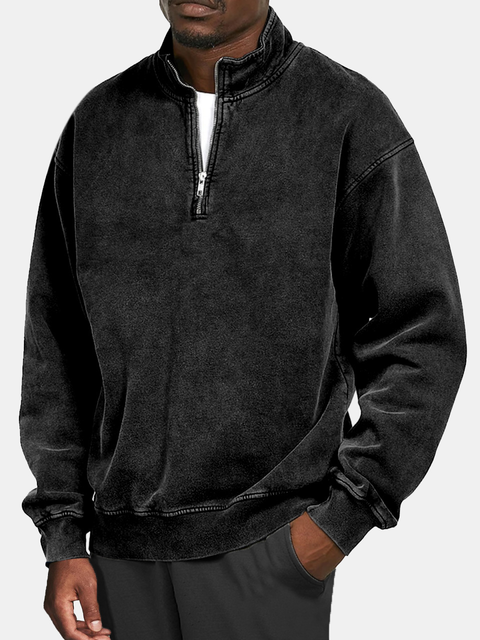 Men's Retro Distressed Solid Color Comfortable Stand Collar Zipper Sweatshirt
