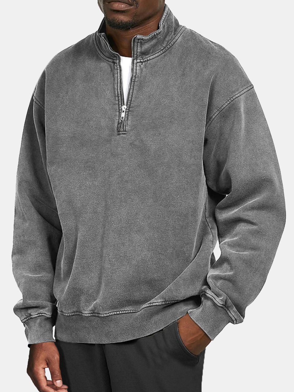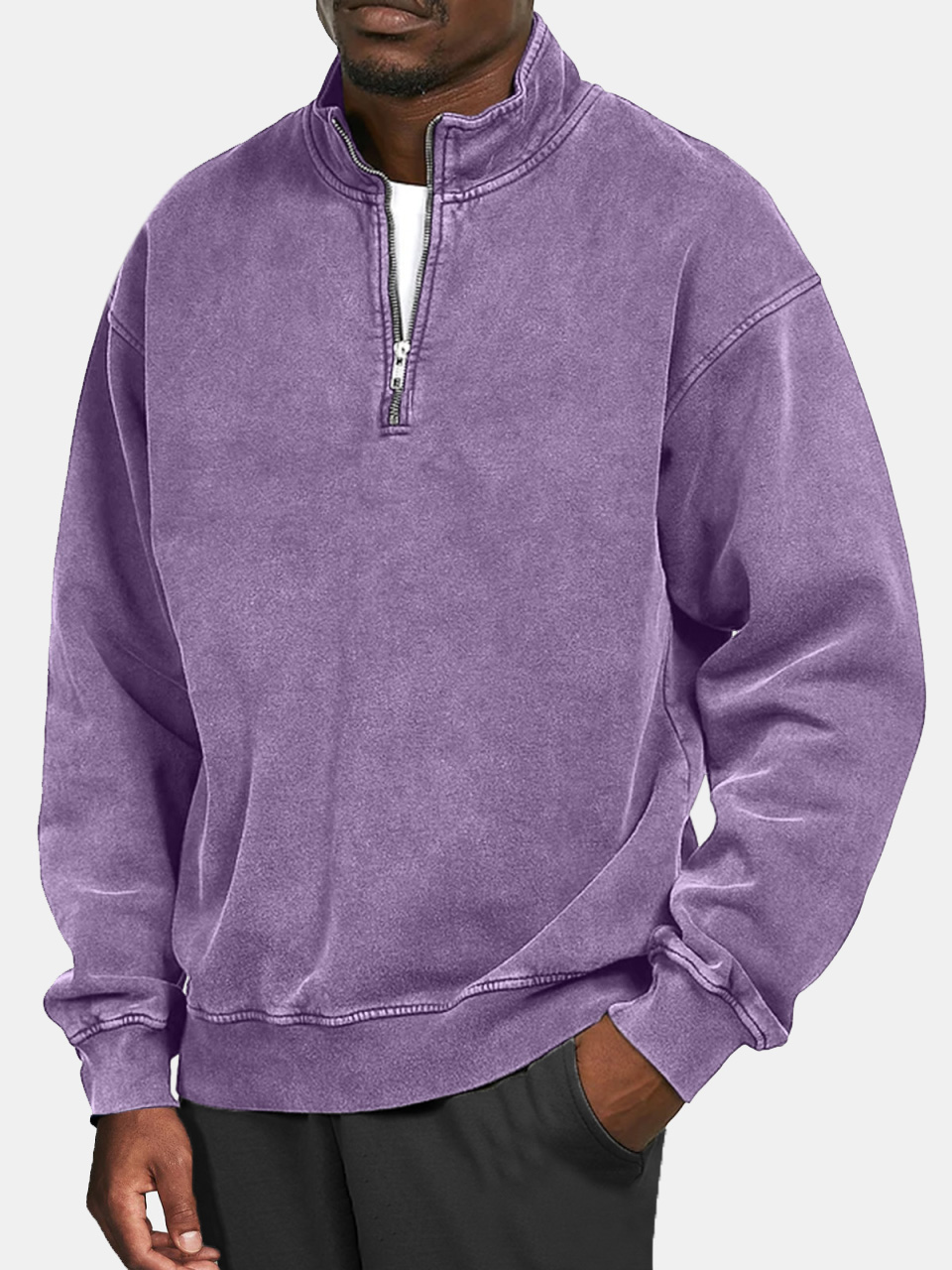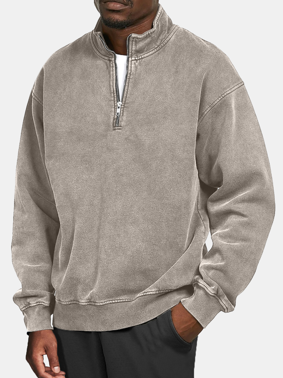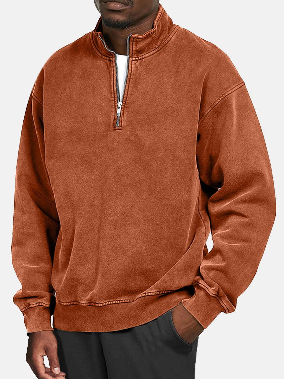 Men's Retro Distressed Solid Color Comfortable Stand Collar Zipper Sweatshirt