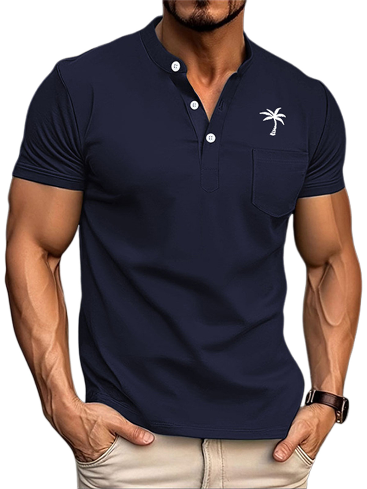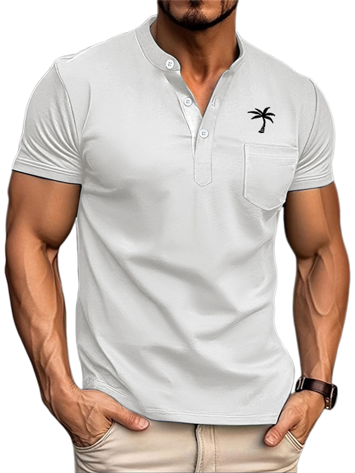Men's Summer Stand Collar Coconut Print Solid Color Pocket Polo Shirt