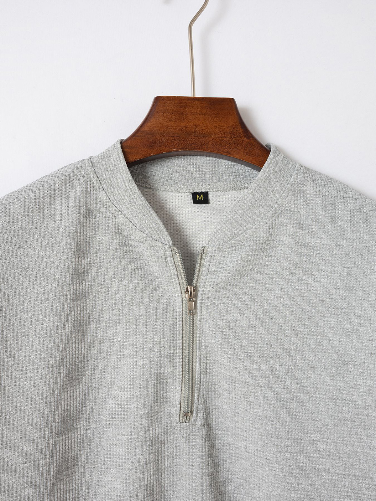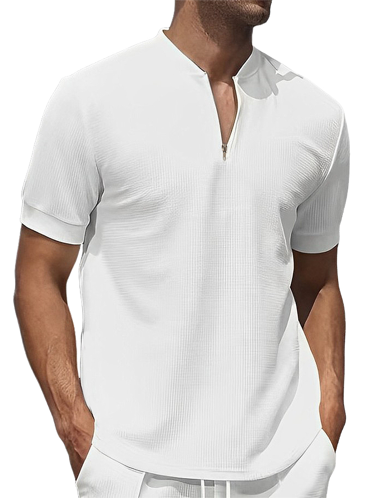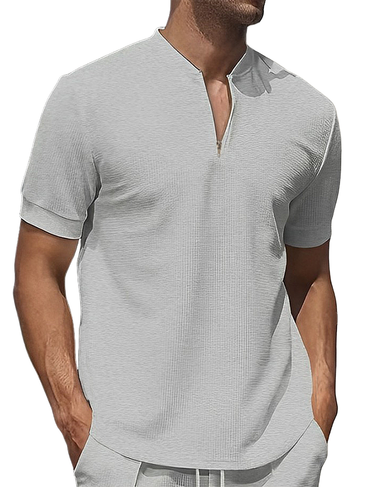 Men's waffle zipper stand collar solid color short-sleeved T-shirt POLO shirt