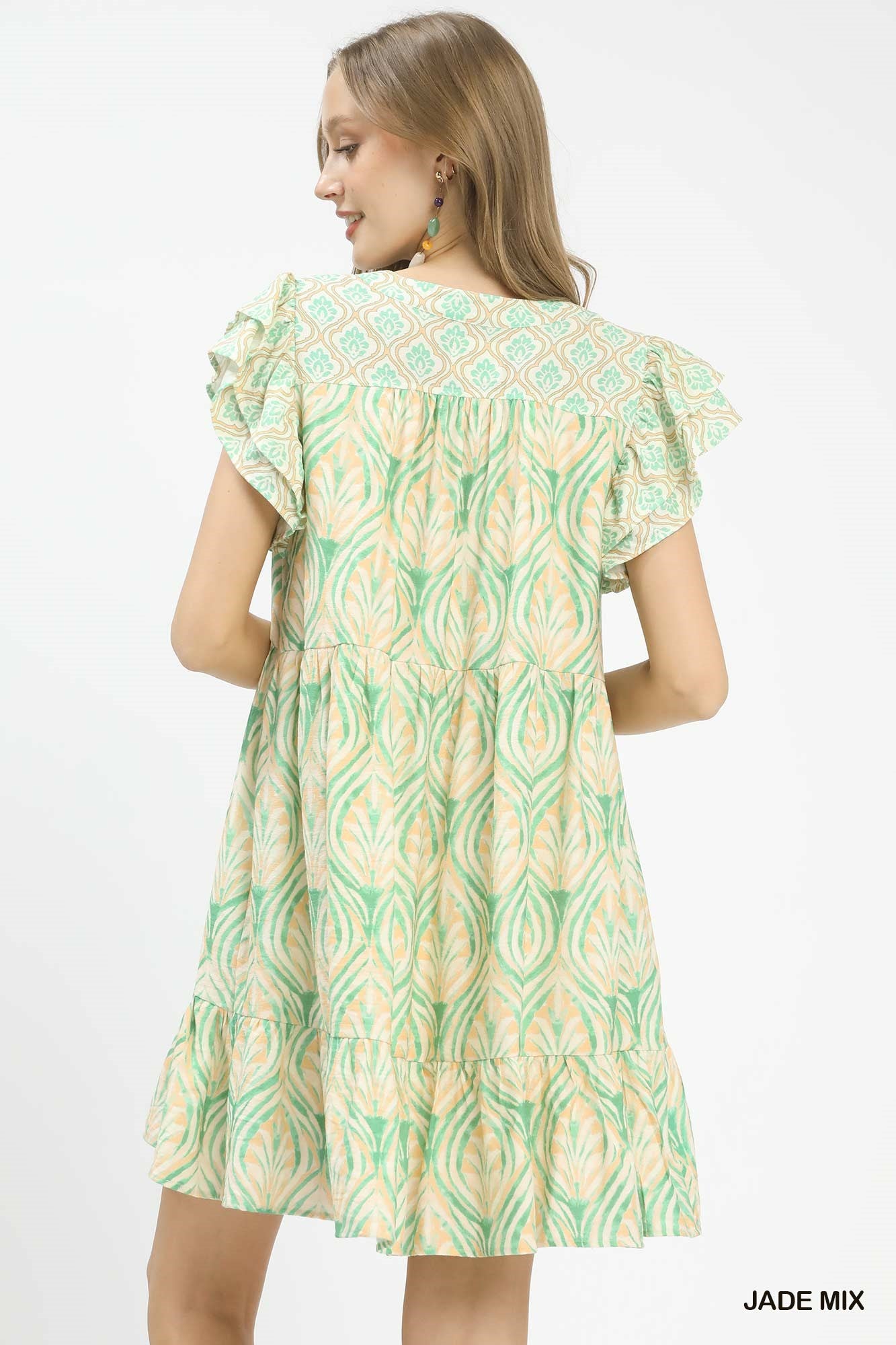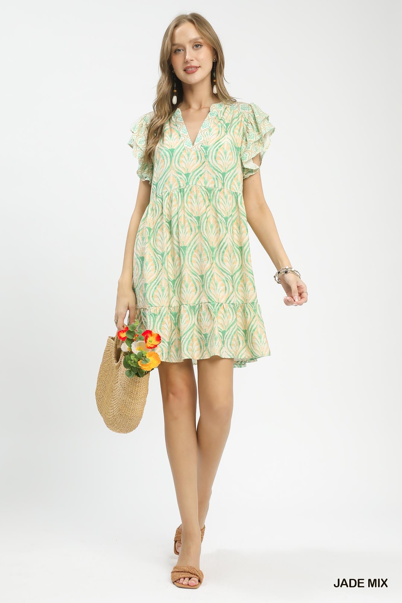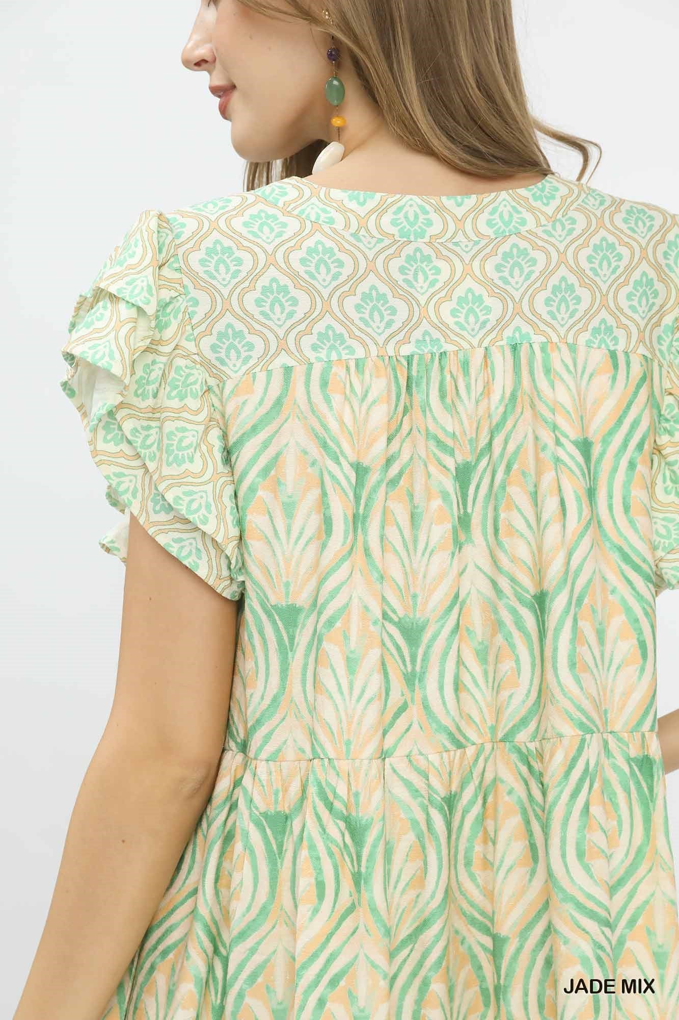 The Mix Printed Flutter Sleeve Dress combines various prints for a unique and eye-catching look. The flutter sleeves add a touch of movement and femininity to the dress. With its mix of prints, this dress offers a playful and eclectic style. Perfect for making a statement and standing out in any setting. Ideal for adding vibrancy and personality to your wardrobe.