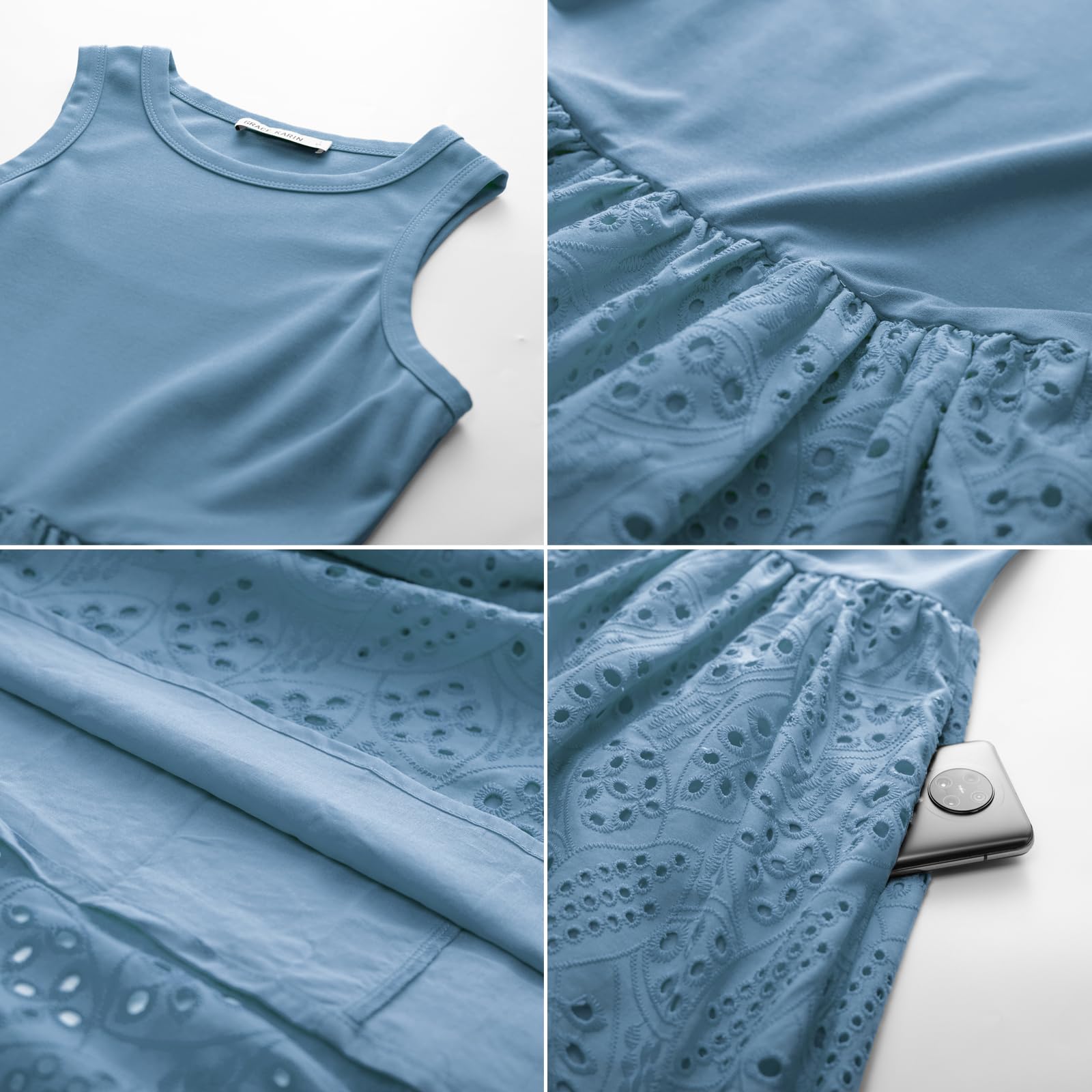 - Features: Sleeveless tank top dress, solid color, round neck, cotton lining, skin-friendly and non-see-through, eyelet hem, two side pockets, pullover, elastic vest, elastic waist, high waist, A-line midi dress, suitable for all body types.